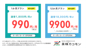 AI採点アップグレード記念 45%OFFキャンペーンライティングAI採点公式版が搭載されたことを記念して、おトクにご利用いただけるキャンペーンを2025年12月25日まで開催いたします。 より採点品質が向上したライティングAI採点機能がすべての過去問に対応し、英検受験に向けて学習するみなさまを応援いたします。 PUBLISHED : 2025.11.05 UPDATED : 2025.11.13