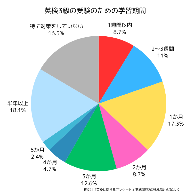 必要な学習時間は、現在の英語力によって大きく異なります。旺文社が行った調査を見てみても、英検3級受験者が対策に費やした期間は様々でした。初めて英検3級を目指す場合は、過去問の正答率を参考に1か月~半年の間で自分に必要な対策期間を設定しましょう。