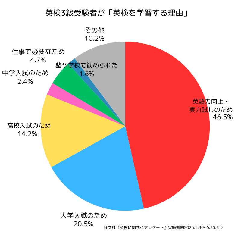 旺文社が行った調査(※)では、英検3級を学習する理由として、「英語力向上・実力試しのため」が46.5%ともっとも多く、「大学入試のため」20.5%、「高校入試のため」14.2%と、大学や高校の入試利用のために受験している人も多いことがわかります。