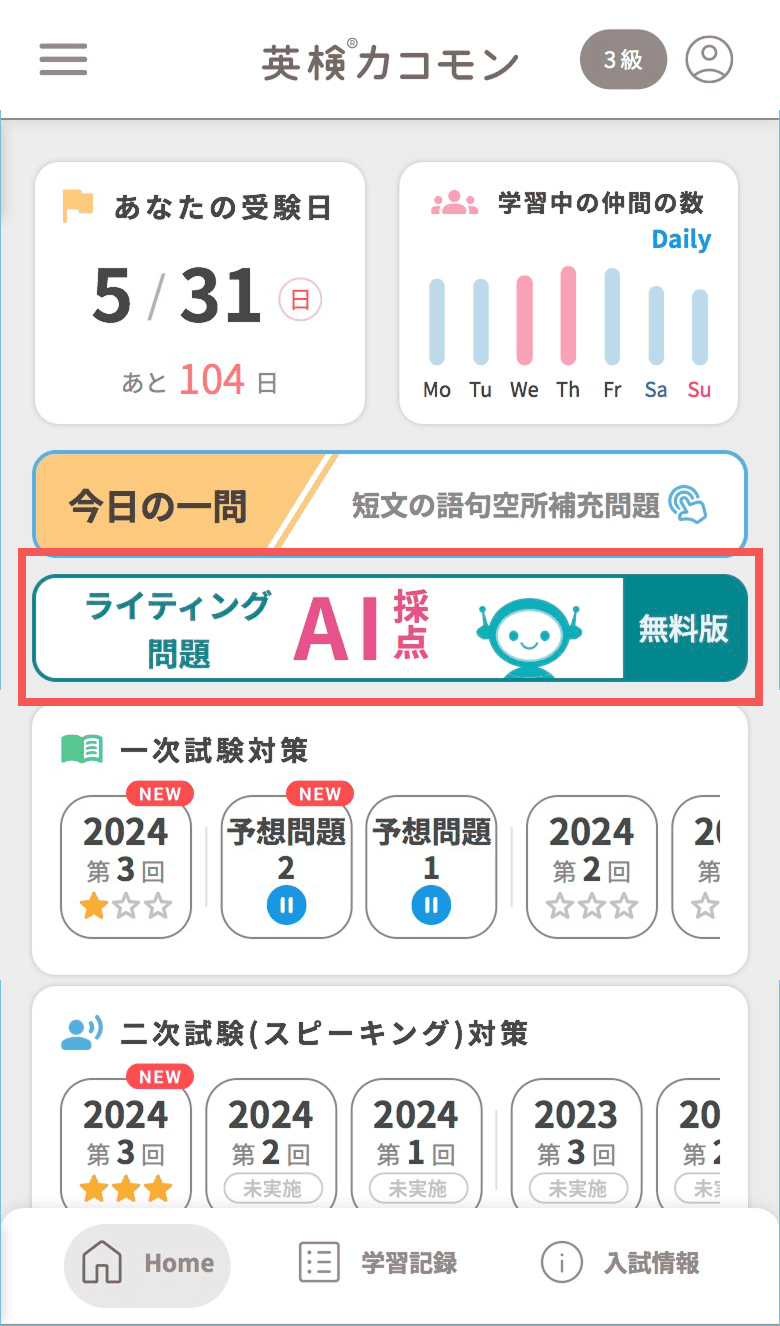 「英検カコモン」3級のホーム画面を開き、ライティング問題AI採点[無料版]を選択します。