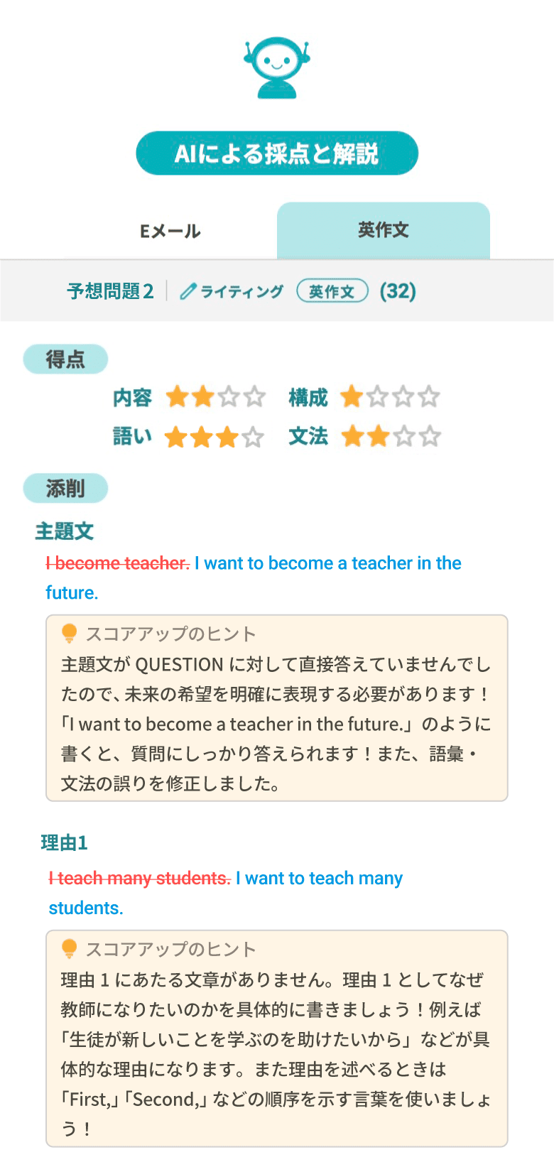 スコアアップに狙いを定めて作られた旺文社独自の評価基準をもとにAIがアドバイスしてくれます。添削結果やスコアアップのヒントを確認し、自分の弱点や具体的な改善点を把握しましょう。
