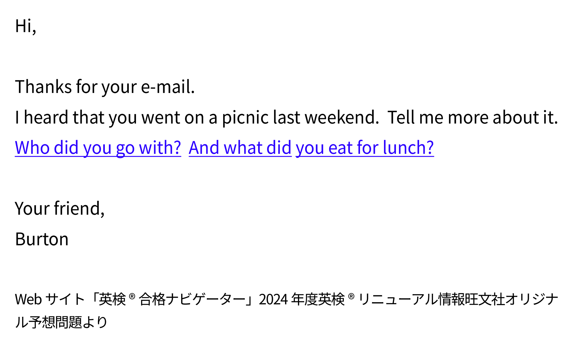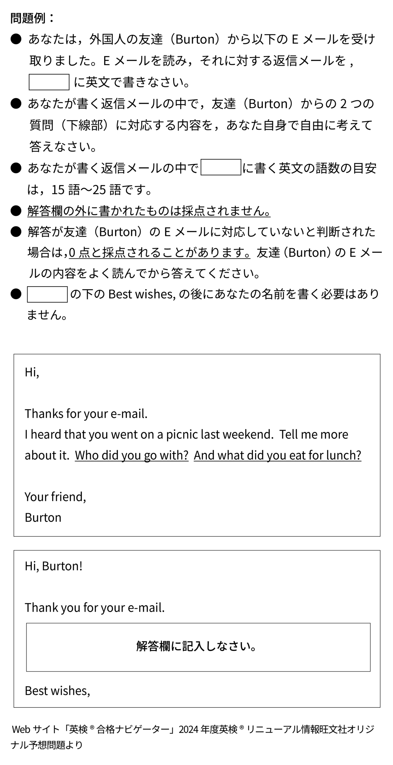 提示された指示文には、「友達からの2つの質問(下線部)に対応する内容を、あなた自身で自由に考えて答えなさい。」という指示があります。問題例の文章の下線部、Who did you go with? And what did you eat for lunch?「誰と一緒に行ったの?そして、お昼に何を食べたの?」という質問への回答をEメールに含めるということをおさえておきましょう。