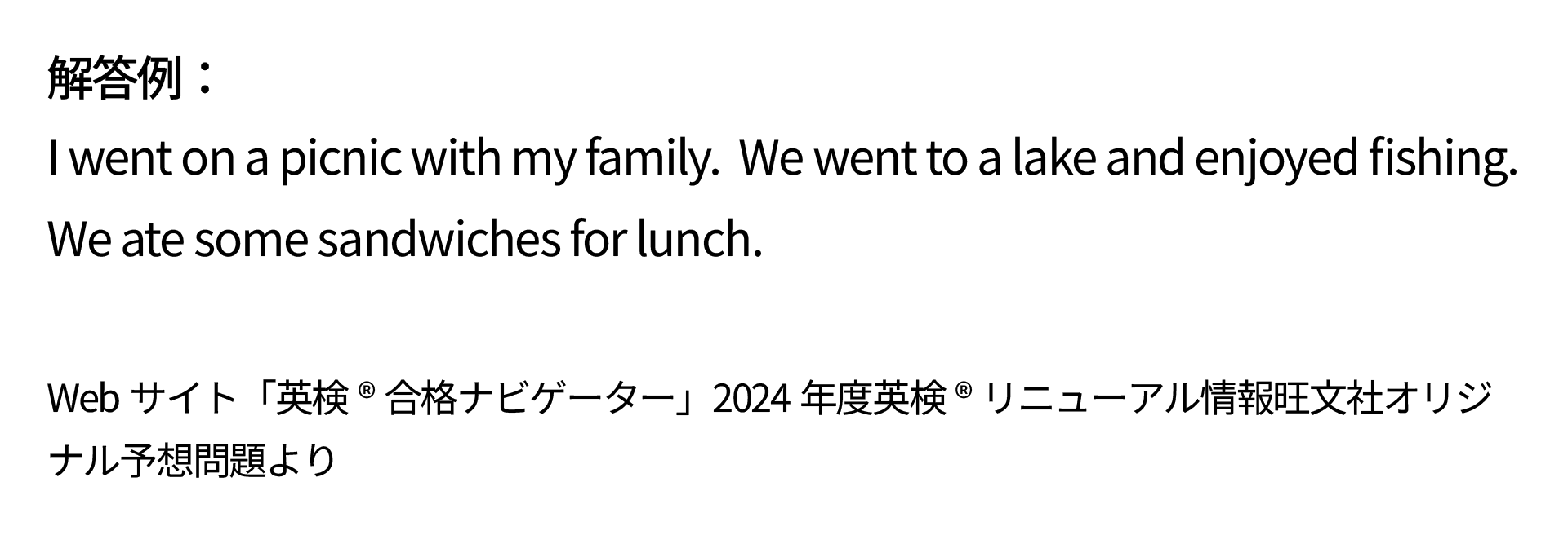 解答例ではさらに、 We went to a lake and enjoyed fishing.「ぼくたちは湖へ行って、釣りを楽しんだよ。」と補足しています。全体の語数を見ながら、内容を補足して語数内におさまるように調整しましょう。