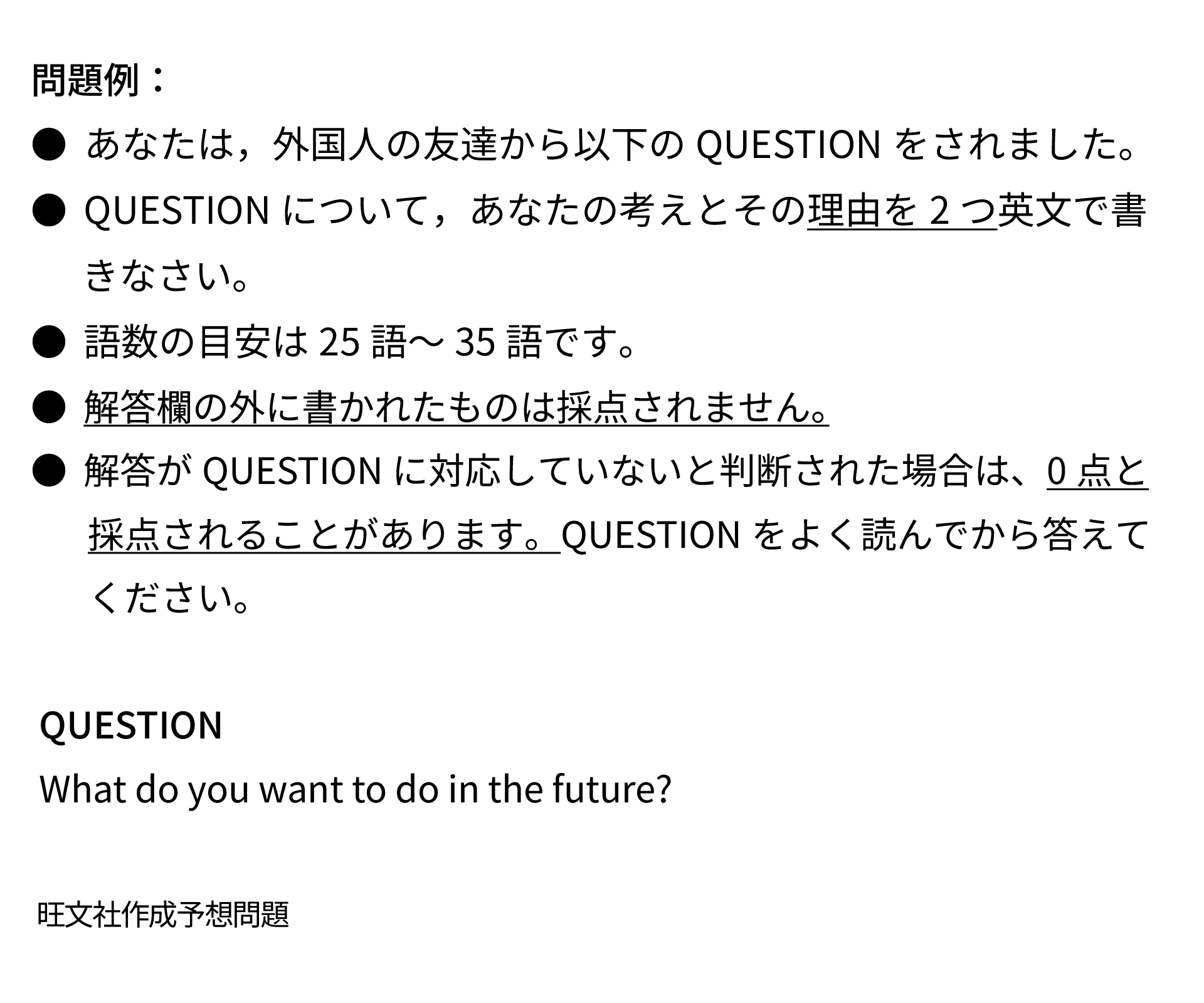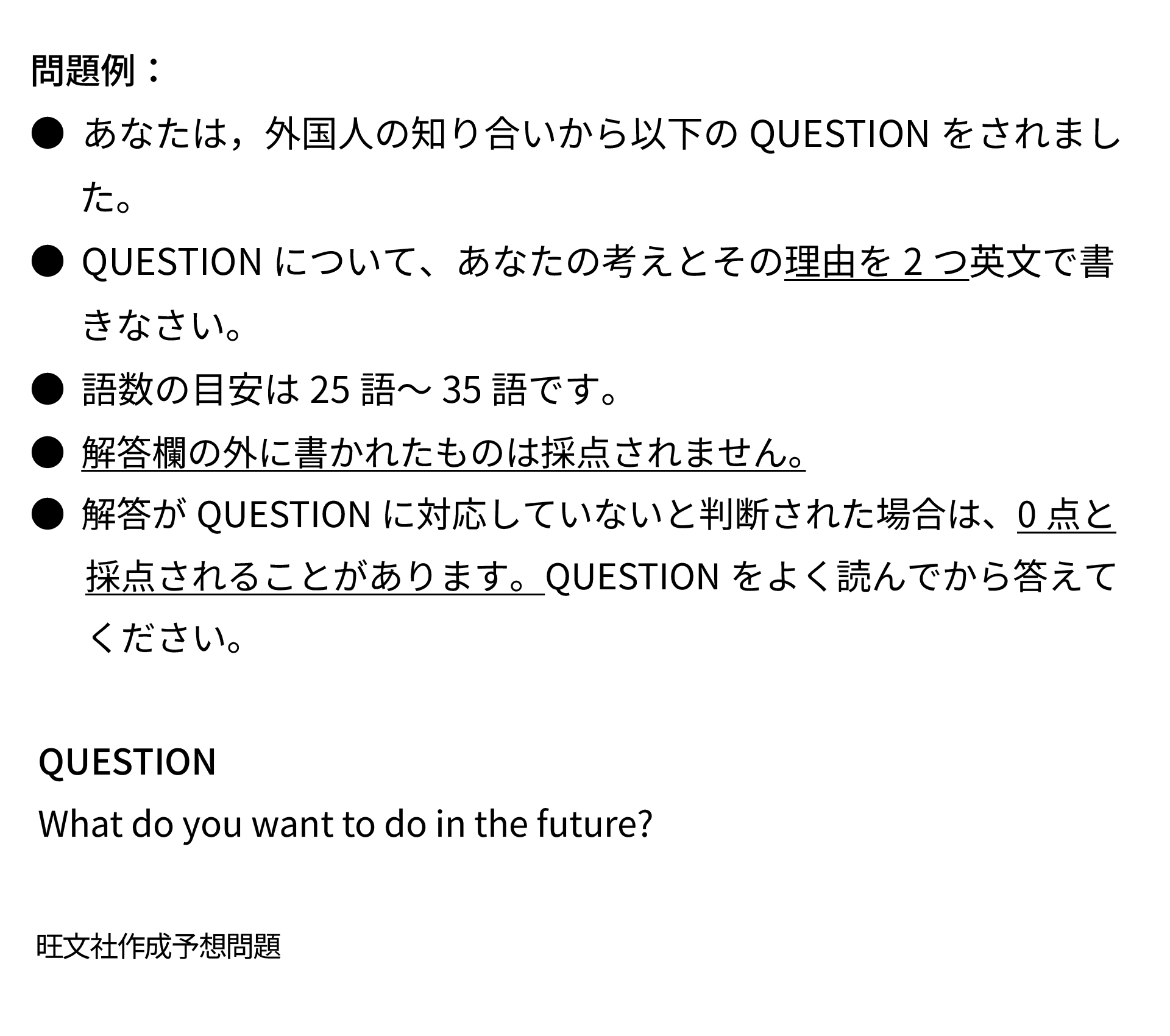 10語程度のQUESTIONについて自分の意見とその理由2つを25~35語程度の英文にまとめることが求められます。