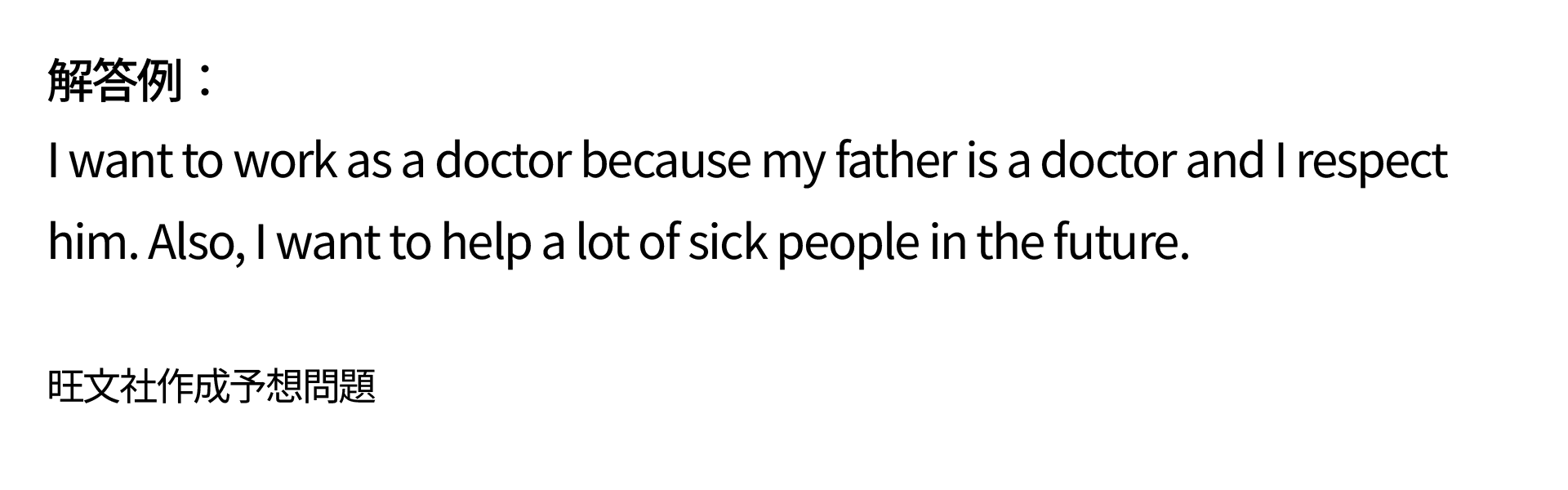 | 理由2 | 2つめの理由と、その具体例や追加の説明 つなぎ語 also 「また、さらに」から始めることで、2つめの理由であることを表すことができる | Also, I want to help a lot of sick people in the future. |