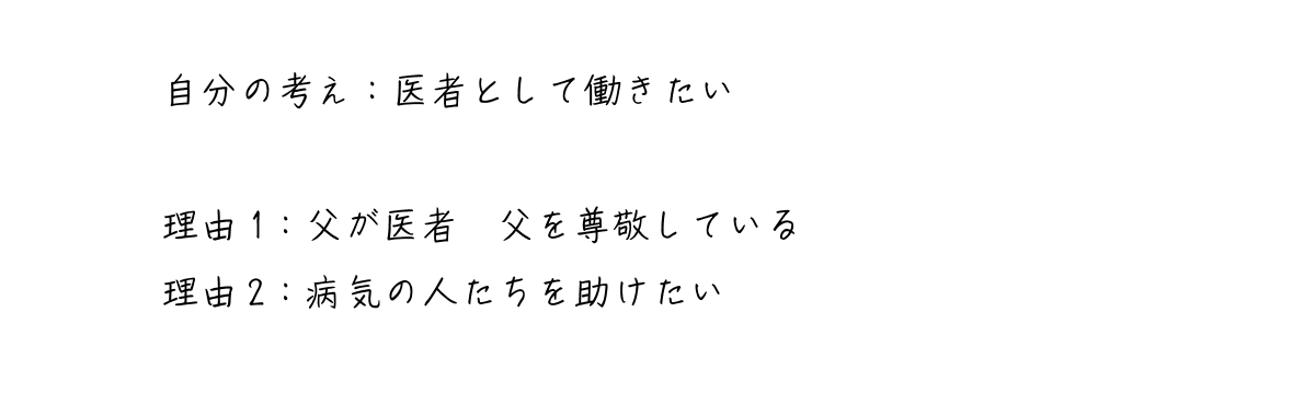 | 理由1 | 1つめの理由 主張に続けて because を使うことで理由を表すことができる | because my father is a doctor and I respect him. |