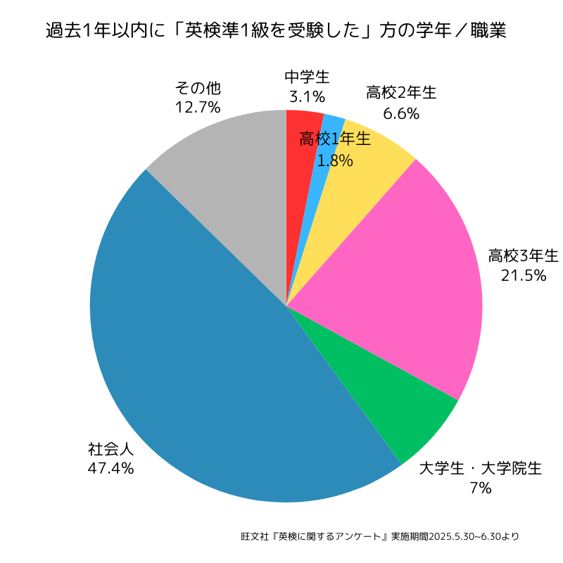 また、旺文社が行った調査(※)では、過去1年以内に「英検準1級を受験した」と回答した方の属性は、「大学生・大学院生」と「社会人」が過半数を占めています。なお、高校生の受験者も約3割存在しています。